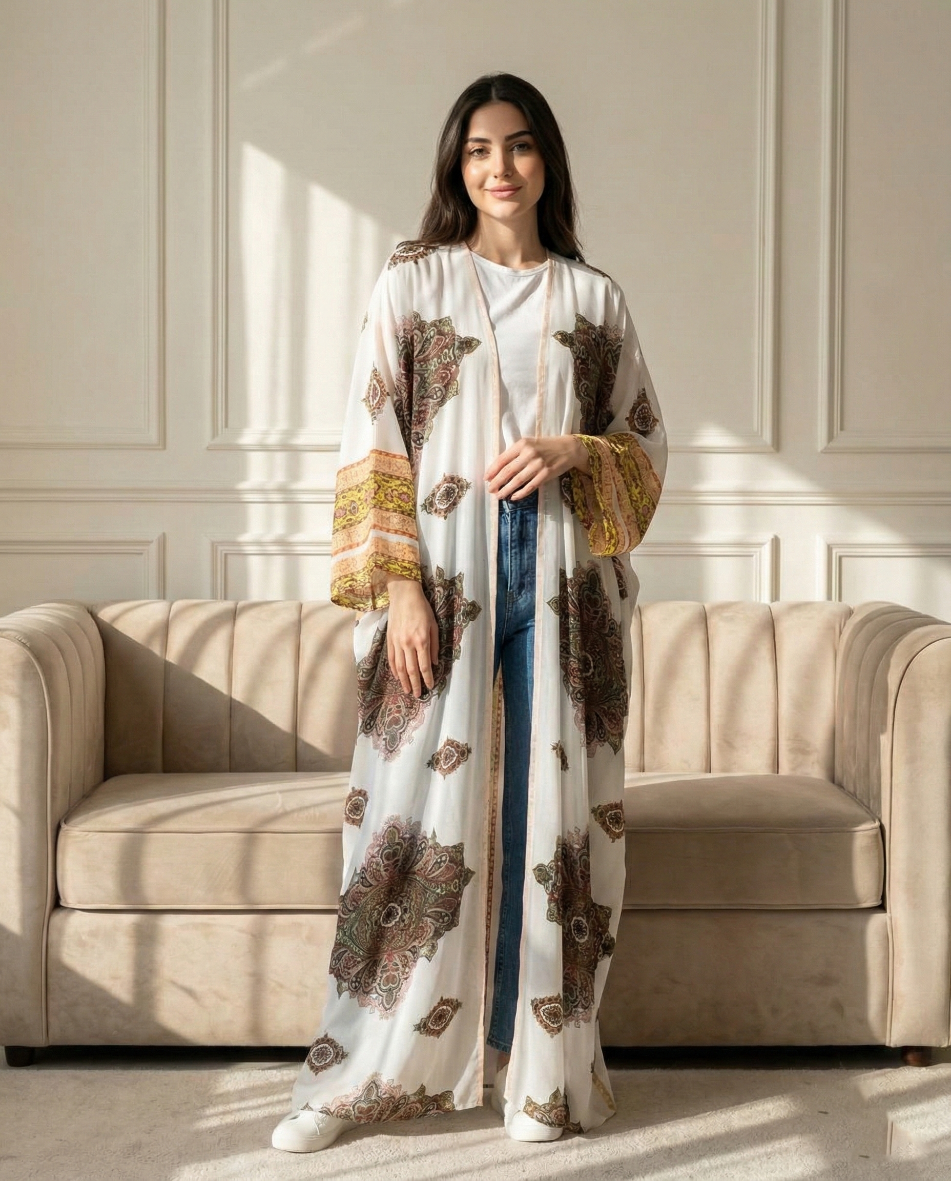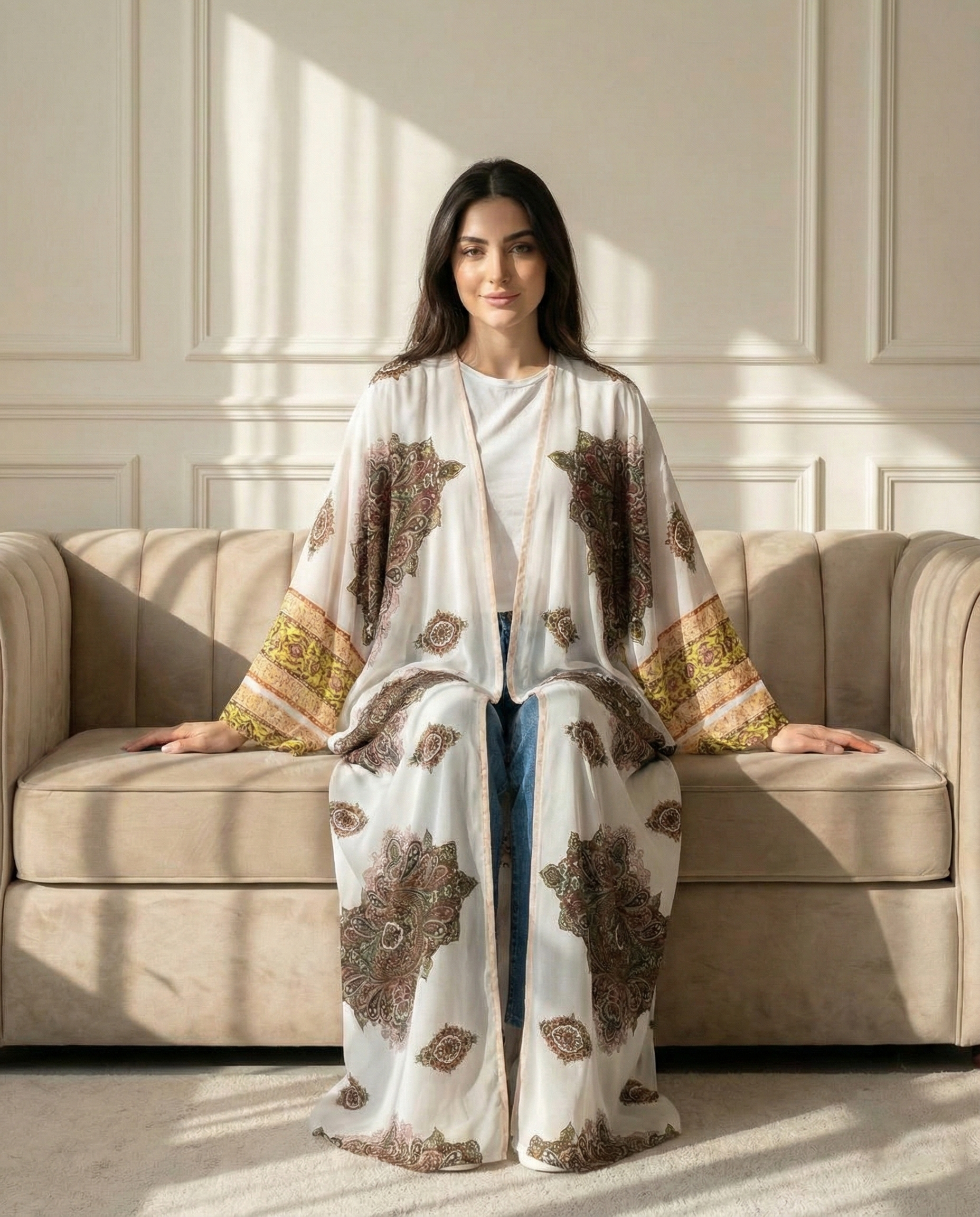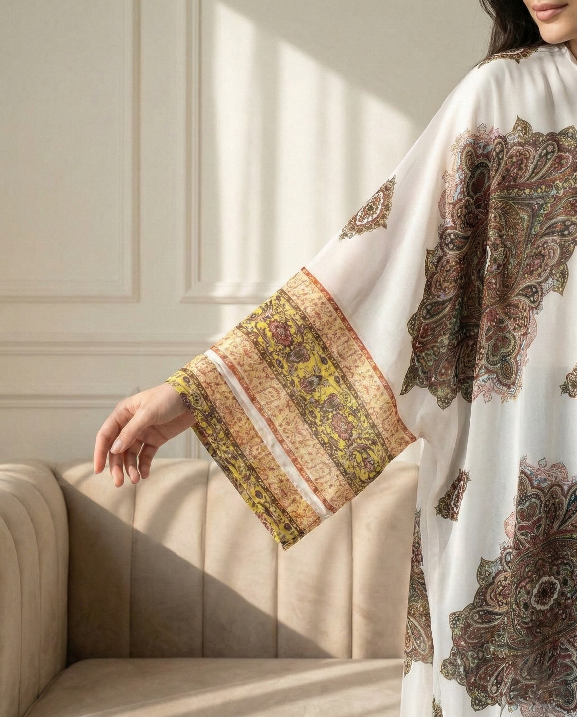 بِشت ليالي الشرق مصنوع من شيفون جاكار إسباني فاخر بنقوش مستوحاة من الطابع الشرقي الدافئ، يمنحكِ إطلالة رمضانية راقية تجمع بين الأصالة والنعومة. قماش خفيف وانسيابي ينسدل بأناقة ليضفي حضورًا هادئًا وفخمًا، مثالي للسهرات الرمضانية والتجمعات المسائية بذوق أنثوي مميز.