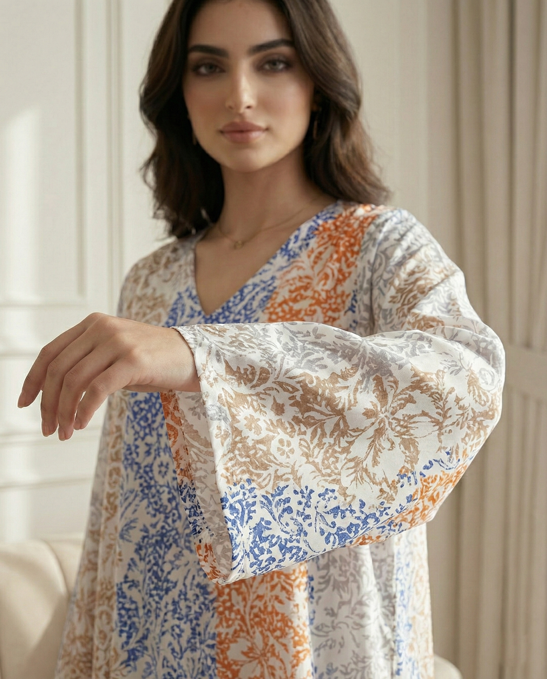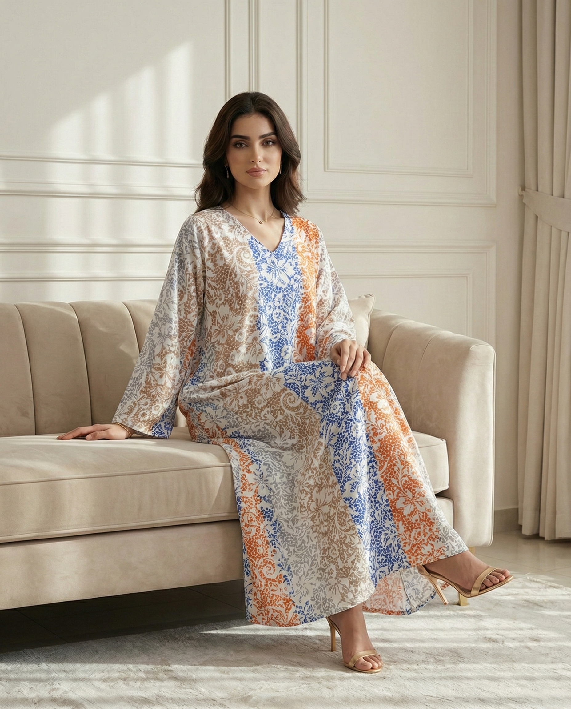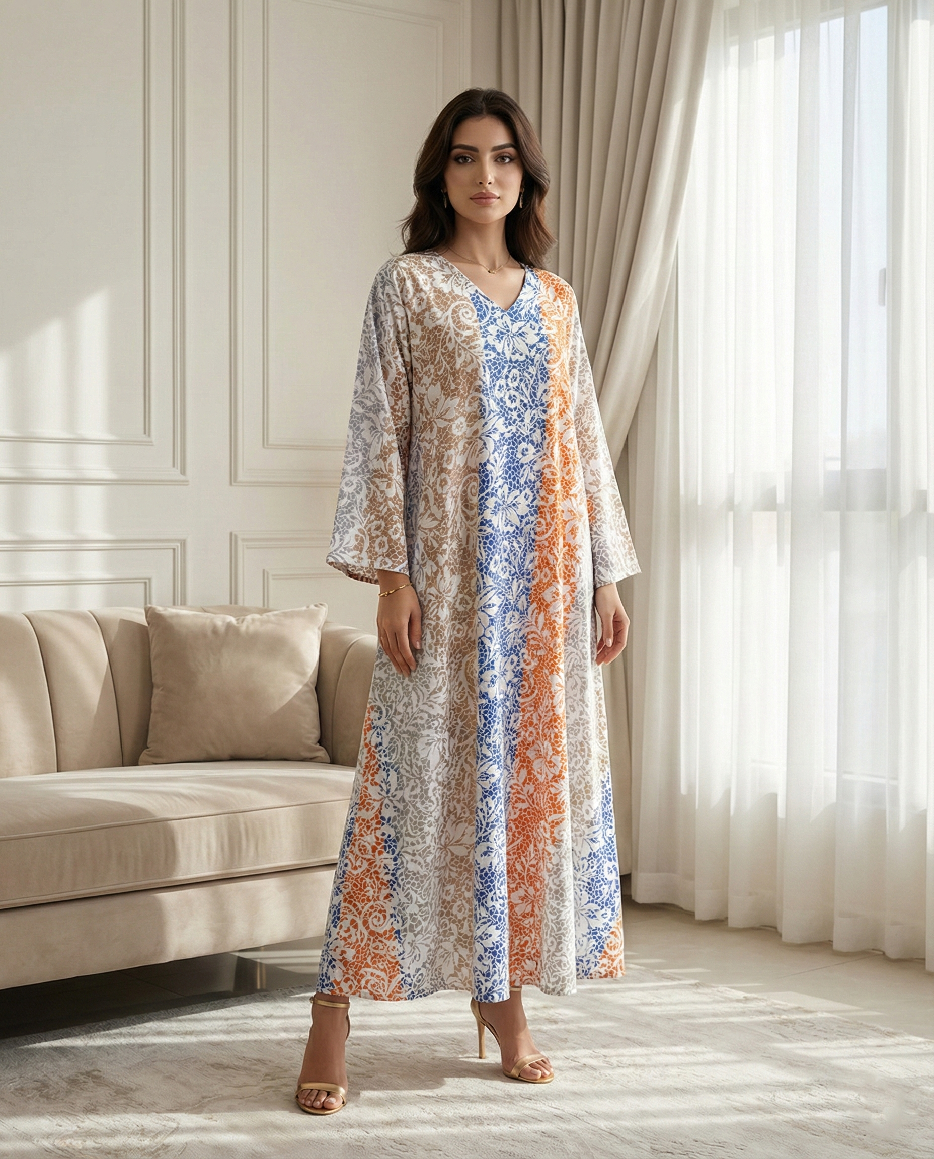 جلابية كويتية بتصميم دبل كلوش انسيابي يمنحك أناقة مريحة وحركة ناعمة مصنوعة من قطن 100% طبيعي بخامة خفيفة ومناسبة للاستخدام اليومي تتميز بطباعة ديجيتال فلورال بألوان ثابتة ولمسة عصرية تناسب المشاوير والمناسبات بطول 58 إنش يمنح تغطية أنيقة ومظهر متوازن