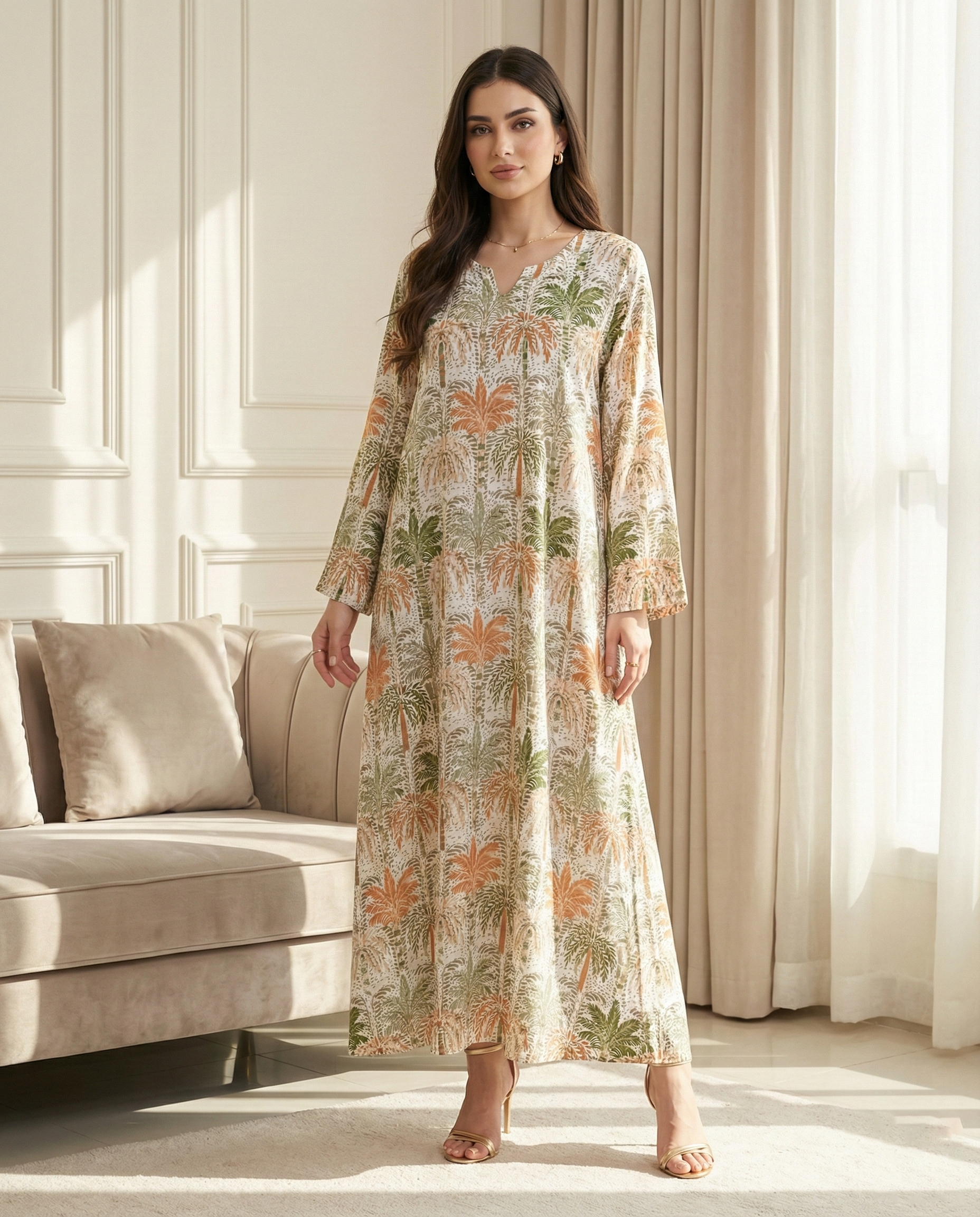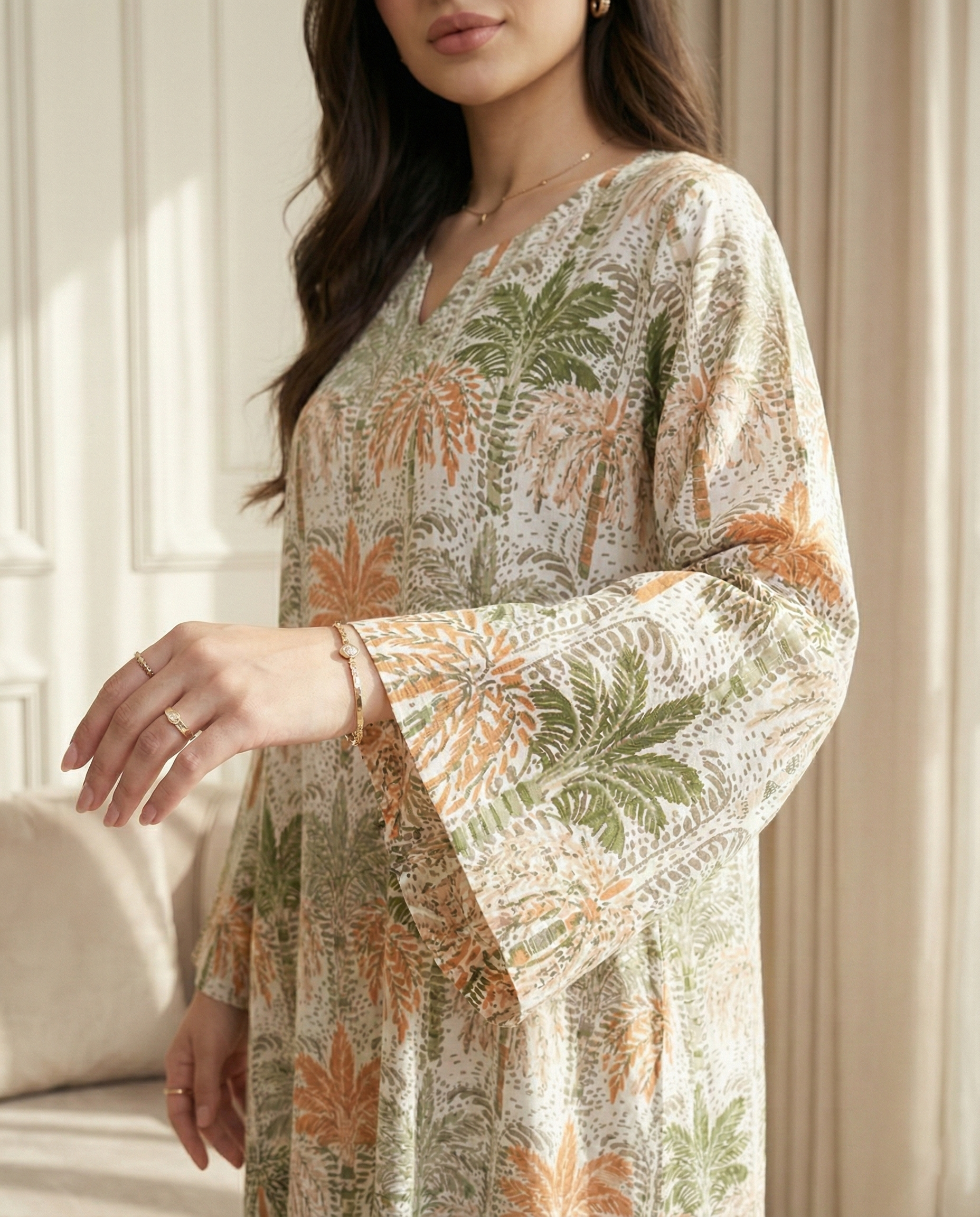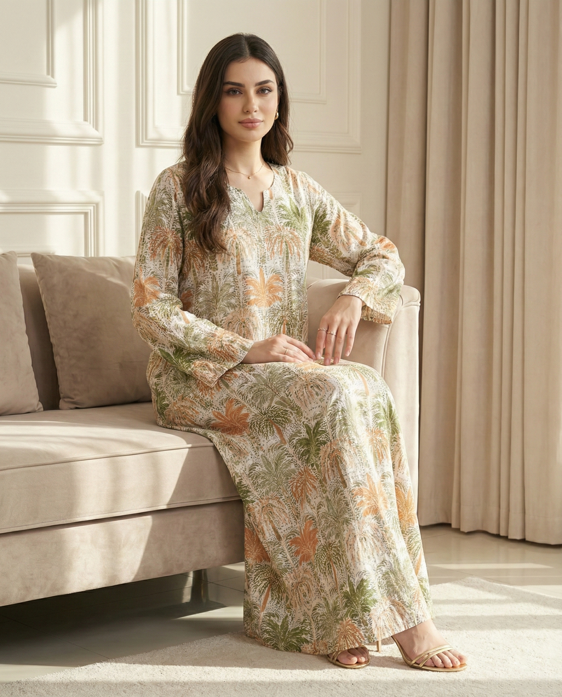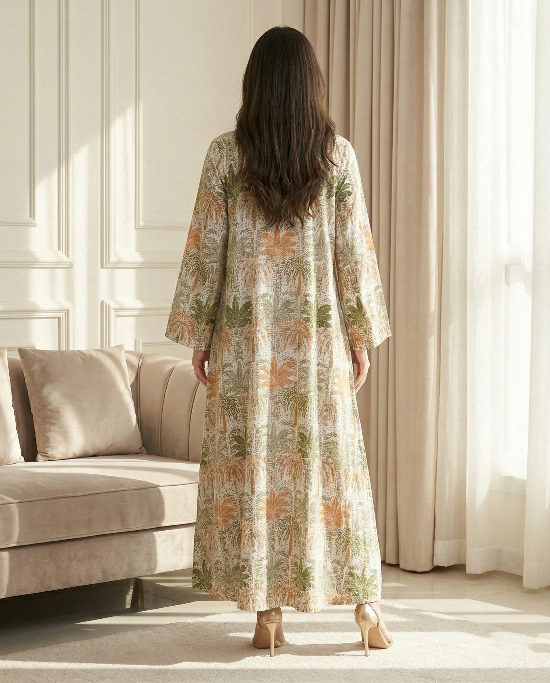 جلابية كويتية بتصميم دبل كلوش انسيابي يمنحك أناقة راقية وحركة ناعمة، مصنوعة من قطن 100% طبيعي بخامة مريحة ومناسبة للاستخدام اليومي. بطول 58 انش تتميز بطباعة ديجيتال عالية الجودة مستوحاة من أشكال النخيل، بألوان ثابتة ولمسة عصرية تناسب المشاوير والمناسبات.
